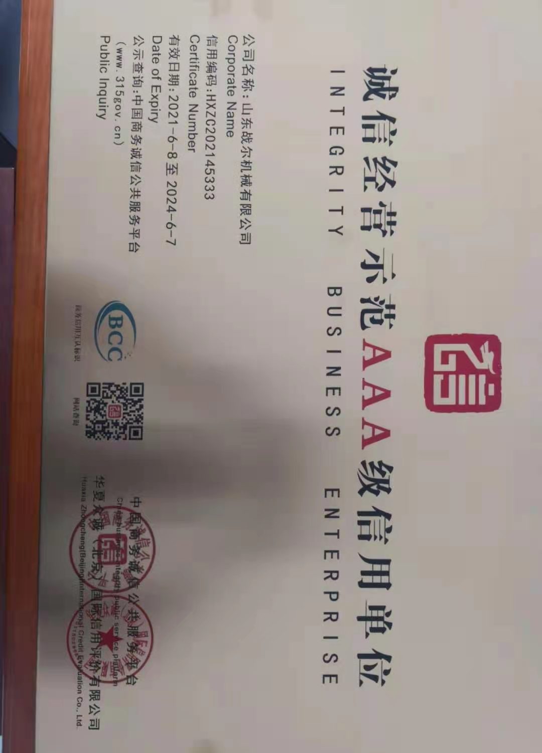 • 企业信用评价AAA级信用企业